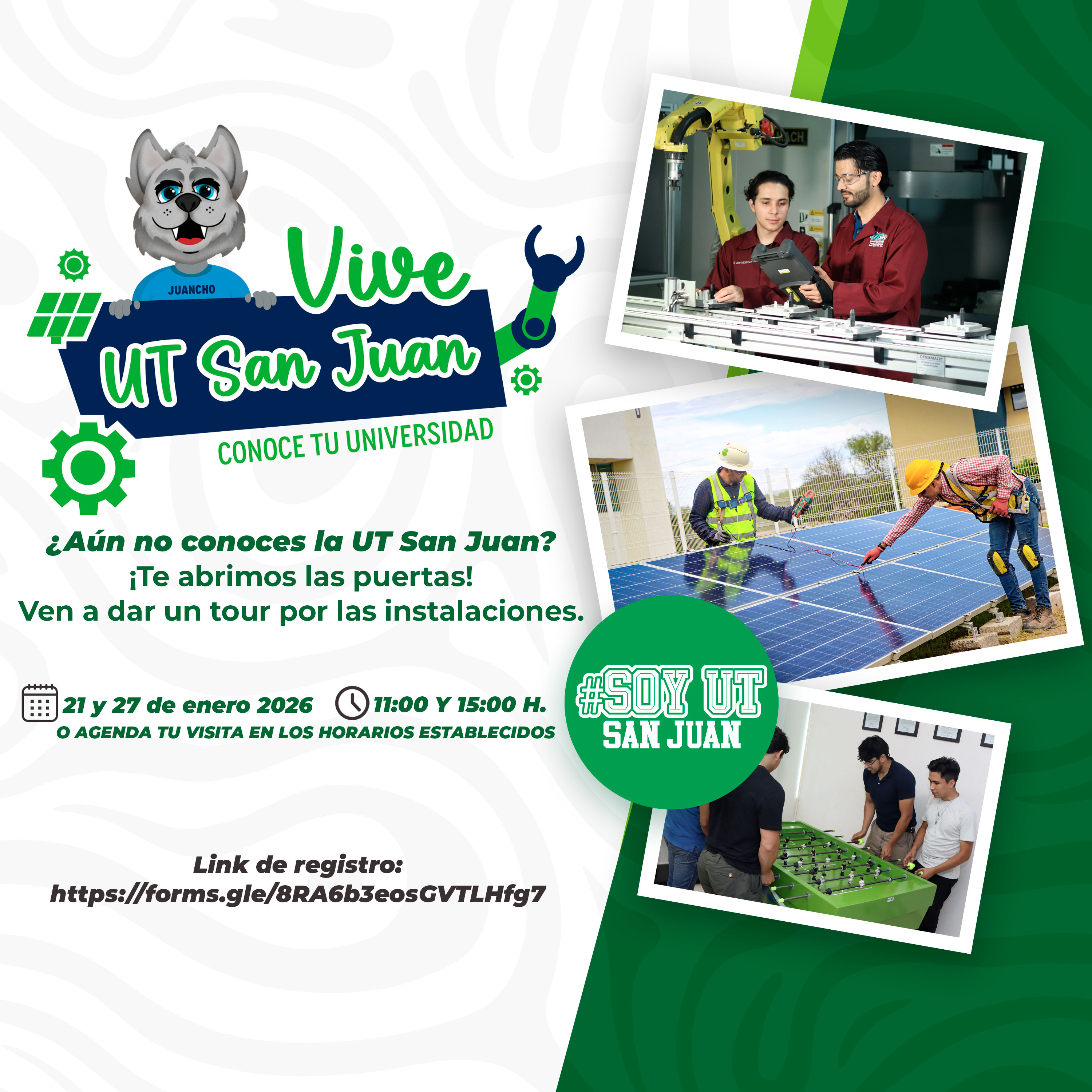 Bajo el lema “Vive UT San Juan” la Universidad Tecnológica de San Juan del Río (UT San Juan) invita a los egresados de preparartoria y bachillerato que aspiran a continuar sus estudios universitarios en esta institución, así como a los padres de familia a conocer su infraestructura, aulas, laboratorios y atributos de su modelo educativo a través de una visita guiada por sus instalaciones.